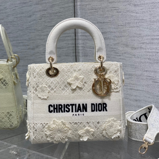 Medium Lady D-Lite Bag White D-Lace Embroidery With 3D Macramé Effect Handbag for Women