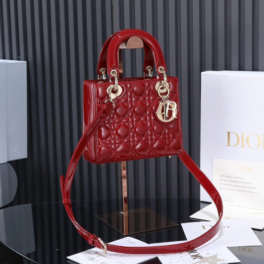 Small Lady D*R Bag Cherry Red Patent Cannage Calfskin Leather Handbag for Women