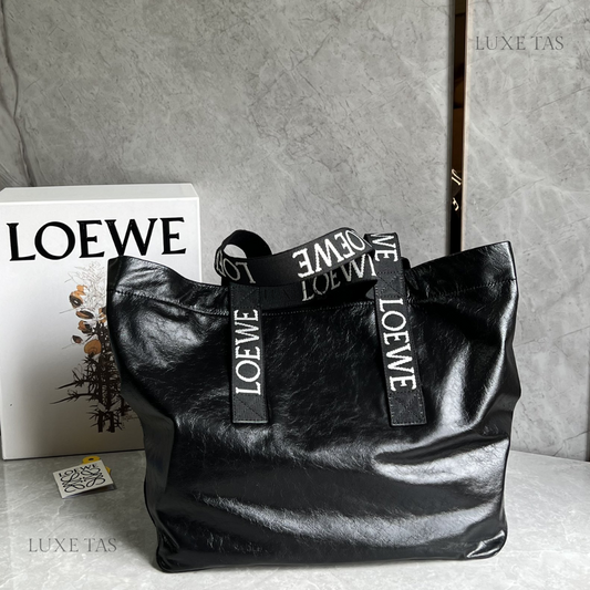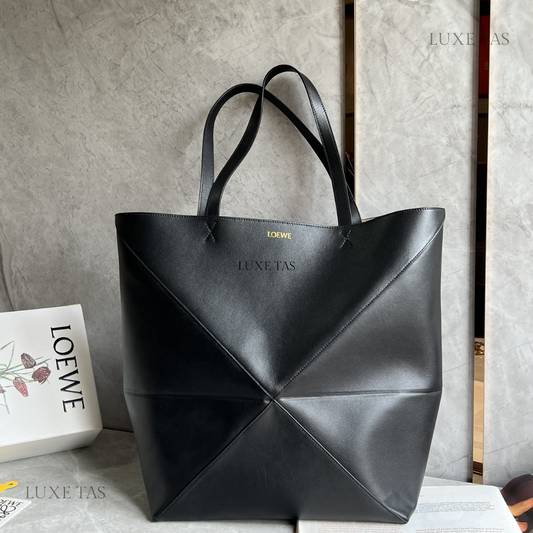 Black Large Puzzle Fold Tote In Shiny Calfskin Leather Tote Bag for Women