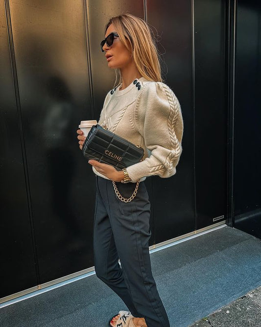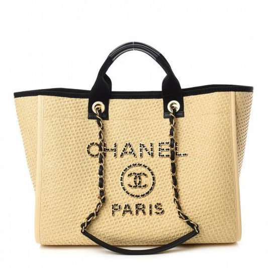 Beige & Black Straw Raffia Calfskin Chain Large Tote Leather Tote Bag for Women